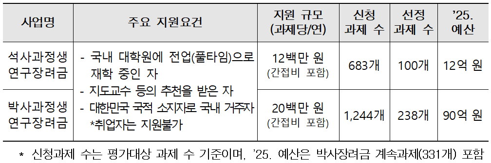올해는 특히 석사과정생 장려금 제도가 처음 신설돼 주목된다. 교육부는 석사 과정부터 체계적인 지원을 통해 학업단절을 예방하고, 안정적인 연구 환경을 조성하고자 올해 처음으로 100명을 선정했으며, 이들에게 1인당 연간 1,200만 원의 장려금을 지급한다.