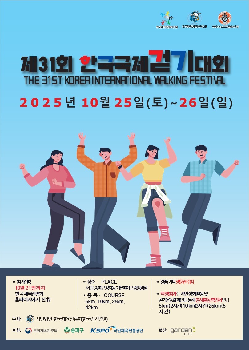 사)한국체육진흥회(회장 선상규)는 제31회 한국국제걷기대회를 문화체육관광부, 서울특별시송파구, 국민체육진흥공단의 후원으로 10월 25일(토) – 26일(일) 서울 송파에 있는 가든파이브 중앙광장에서 개최한다.