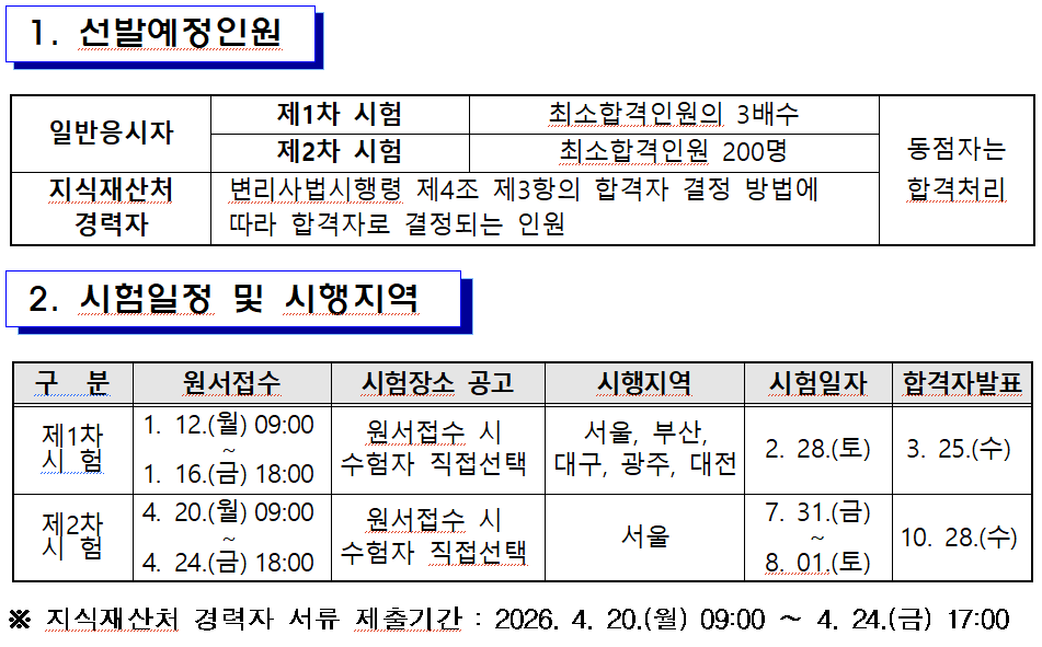 한국산업인력공단은 2025년 11월 21일 ‘2026년도 제63회 변리사 국가자격시험 시행계획’을 공고하고 시험 일정과 응시 요건, 영어성적 인정기준, 장애인 편의지원 등 세부 사항을 확정했다. 이에 따르면 이번 시험에서도 기존 선발 구조를 유지해 제1차 시험 최소합격인원은 선발 예정 인원의 3배수로 정하고, 제2차 시험은 절대평가 방식의 논술형 주관식 시험으로 200명을 최종 선발한다.