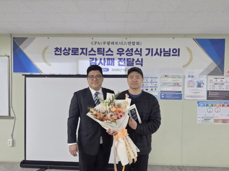 쿠팡 택배 영업점 단체인 쿠팡 파트너스 연합회(CPA, 회장 신호룡)는 지난 25일 제주를 방문해 새벽 배송 중 화재를 조기에 발견하고 초동 진화를 통해 이웃의 생명과 재산을 지킨 천상로지스틱스 소속 우성식 쿠팡 택배 기사에게 공식 감사패를 전달했다고 27일 밝혔다.